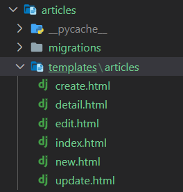 - 앱 내에 templates 폴더를 생성하고, 하위 폴더로 앱 이름의 폴더를 하나 더 만든다.이후의 템플릿 html 파일은