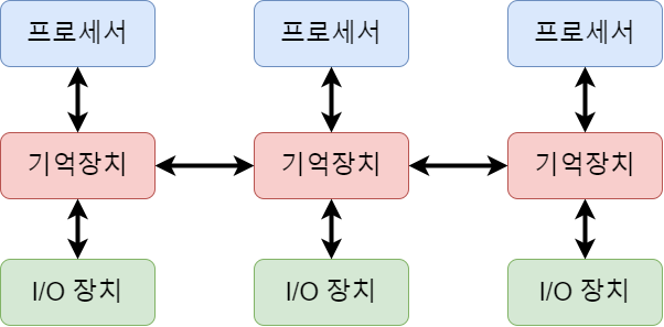 - 각 CPU는 자신의 지역 기억장치를 가짐