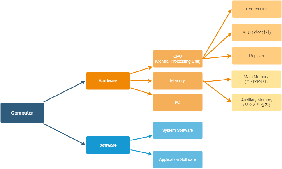 구성요소: 중앙처리장치(CPU), 기억장치(메모리, 디스크), 입출력장치(마우스, 모니터, 프린터 등)